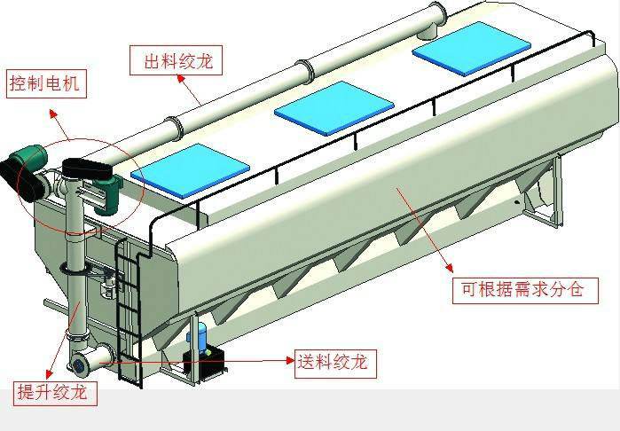 上裝罐體:罐體材質(zhì)采用4mm優(yōu)質(zhì)碳鋼板,整車3條絞龍,通過變速箱帶動取力器取力后帶動各絞龍工作可左右旋轉(zhuǎn)180°。罐體內(nèi)分為貳個倉,可以獨立控制各分倉卸料順序和速度。